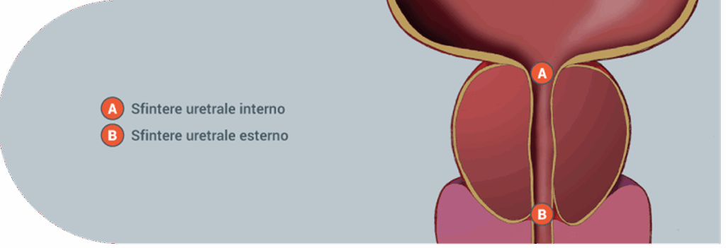 La continenza urinaria, cioè la capacità di controllare il flusso dell’urina, dipende dal tono di chiusura di due sfinteri muscolari che circondano l’uretra nel tratto che attraversa la prostata:
